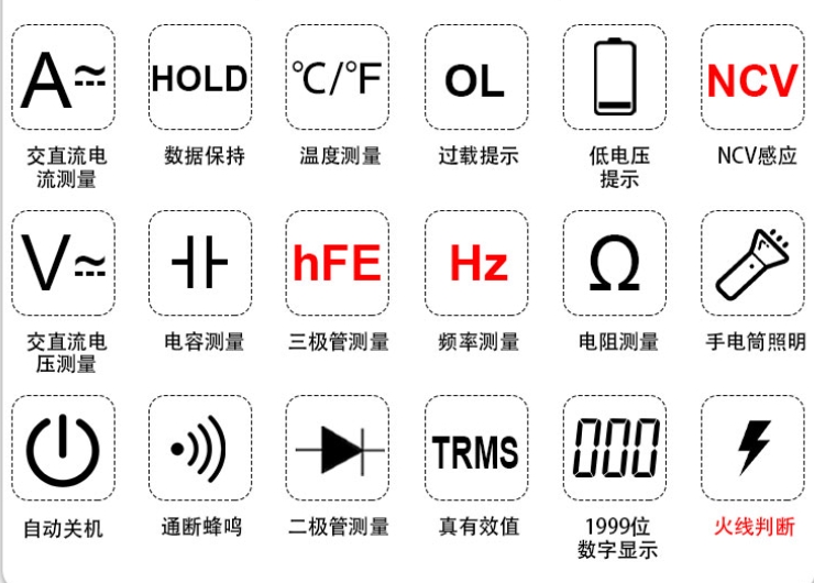 交流1000V檔可測量交流電頻率; 大屏高清LCD液晶顯示,1999(3 4)自動極性顯示單位符號顯示,數(shù)字清晰不重影,簡單易懂; 萬用表帶防震保護(hù)套設(shè)計,防刮花,耐撞擊雙重保護(hù)更安全使用更放心,讓測量無憂; 儀器開機(jī)在無操作下,約15分鐘自動關(guān)機(jī)(可取消),節(jié)能電量消耗增加儀器使用壽命。