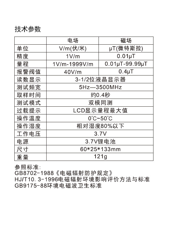 電磁輻射測試儀成功的將電場輻射、磁場輻射兼容測試并達到不錯的測試效果,用于測試并了解室內室外環(huán)境的電磁輻射現(xiàn)狀。產品內置電磁輻射傳感器,通過微控制芯片處理后,以LCD數字顯示輻射值。根據測試結果對電磁輻射進行合理處理或有效躲避。
