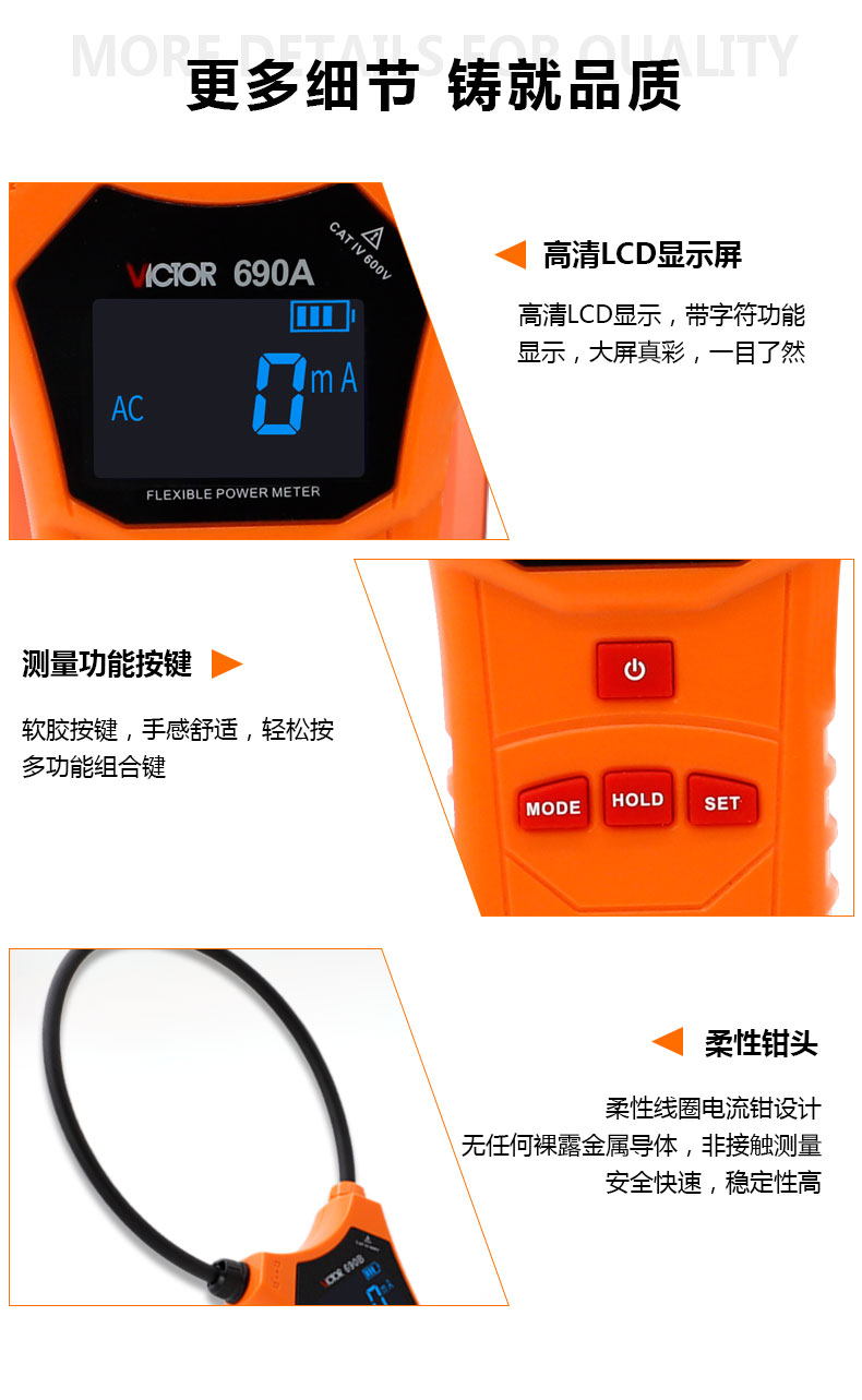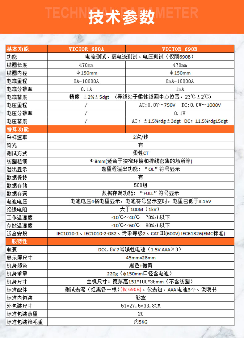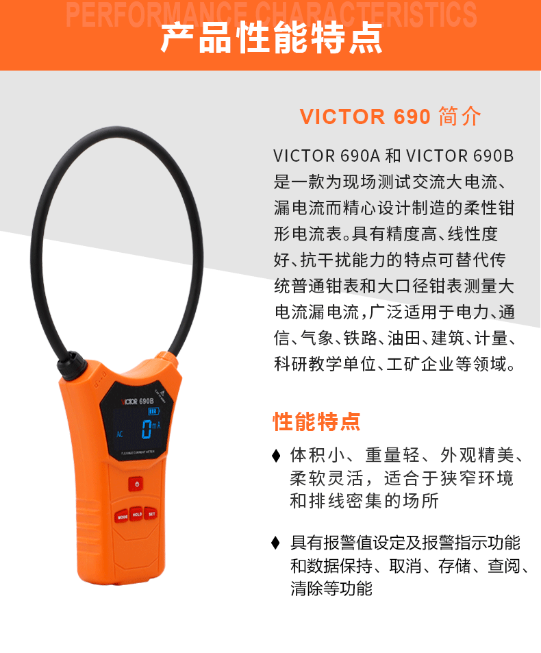 產品型號:VICTOR 690A 690B產品名稱:VICTOR 690A 690B柔性線圈大電流漏電流鉗表