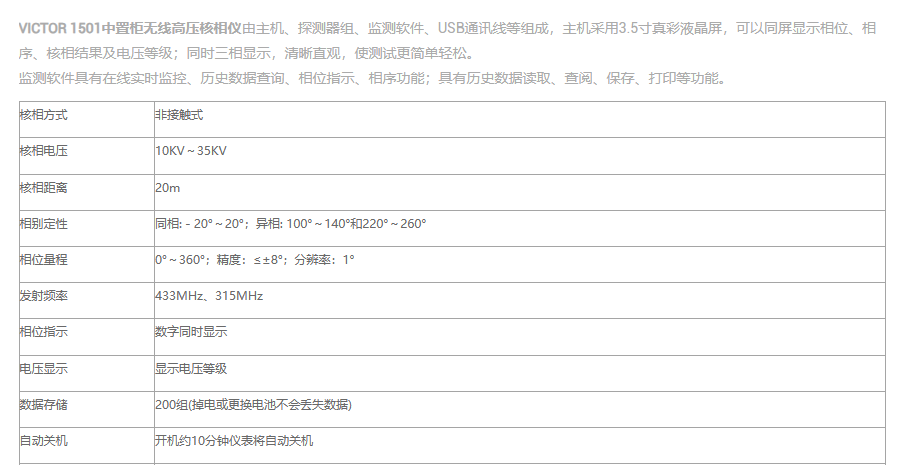 VICTOR 1501中置柜無線高壓核相儀是專為手車式高壓開關(guān)柜(中置柜)核相而精心設(shè)計制造,本儀器采用非接觸式核相技術(shù),在中置柜外接收核相數(shù)據(jù),即可對A、B、C三相線路同時完成相位判斷,相序測試,規(guī)避了操作人員與柜內(nèi)高壓電直接接觸的風(fēng)險,排除了核相的安全隱患,確保了操作人員和設(shè)備的安全。儀器操作特別簡單,安全快速。