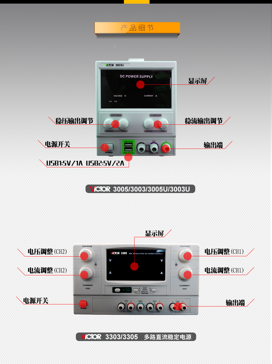產(chǎn)品型號:VICTOR3005 3003 操作方式:自動量程產(chǎn)品名稱:直流穩(wěn)定電源 顯示位數(shù):說明書下載VICTOR 3000型系列直流穩(wěn)定