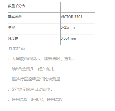 產(chǎn)品型號(hào): VICTOR 5501 操作方式:產(chǎn)品名稱:數(shù)顯千分尺 性能特點(diǎn).大屏液畫(huà)畫(huà)顯示,讀鼓清晰、直觀