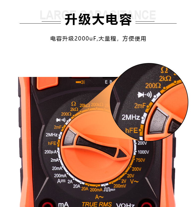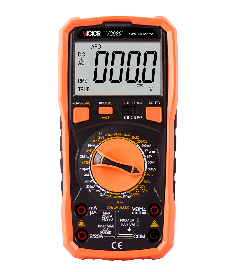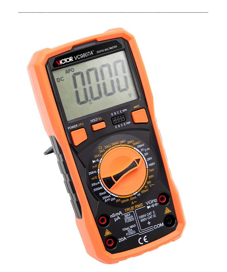 VC9806+/VC9807A+/VC980+萬(wàn)用表 2021款; 4 1/2位手動(dòng)量程; 大撥盤功能旋鈕功能齊全操作便捷; 手電功能方便夜間作業(yè),表筆插槽讓收納變簡(jiǎn)單; 7號(hào)電池便于更換,雙保險(xiǎn)管設(shè)計(jì)保護(hù)電路;