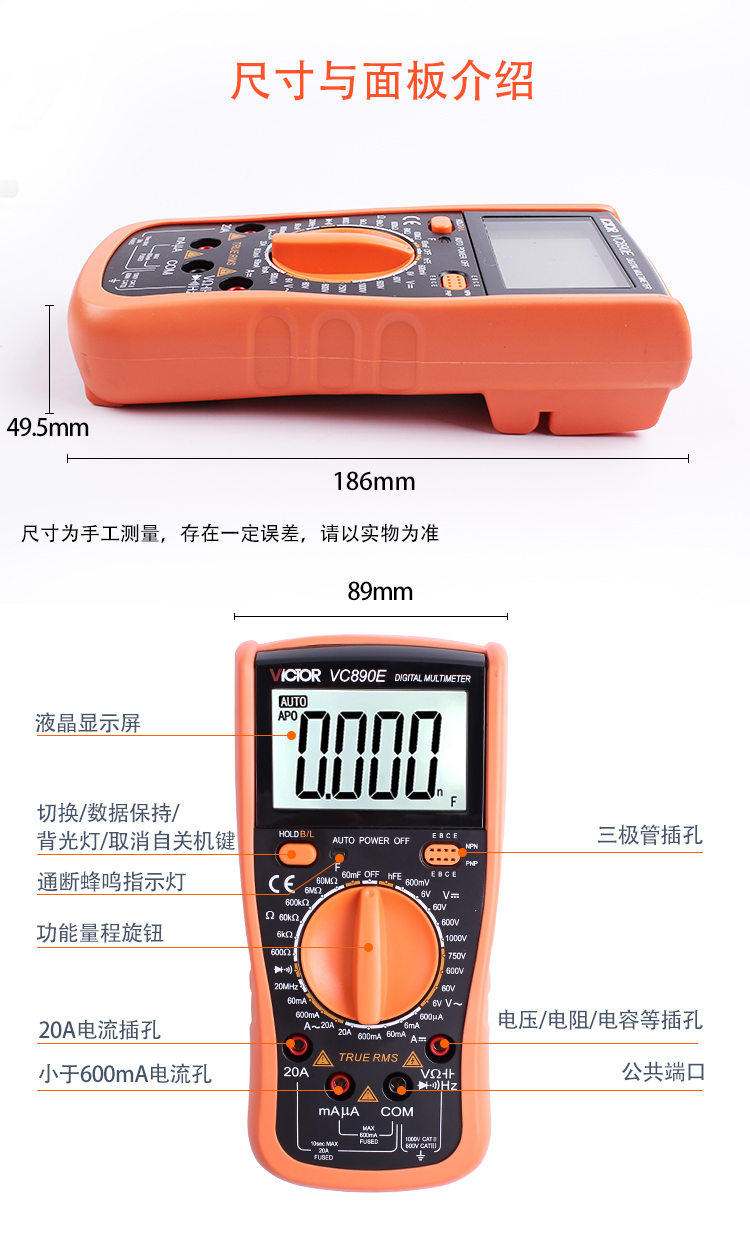 產(chǎn)品型號(hào):VICTOR 890E 操作方式:自動(dòng)量程產(chǎn)品名稱:數(shù)字萬用表 顯示位數(shù):3 1 2位